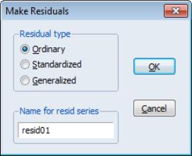 “Residuals”). If ORESID are the ordinary and SRESID are the standardized residuals for equation EQ1, then the commands