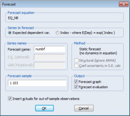 Lastly, specify whether you wish to produce a forecast graph and whether you wish to fill non-forecast values in the workfile with actual values or to fill them with NAs. For most cross-section applications, we recommend that you uncheck this box.