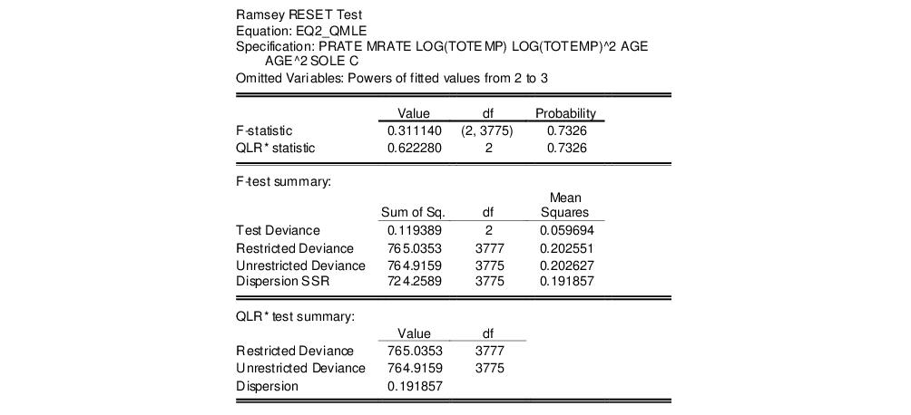We point out that the Ramsey test results (and all other GLM LR test statistics) presented here may be problematic since they rely on the GLM variance assumption, Papke and Wooldridge offer a robust LM formulation for the Ramsey RESET test. This test is not currently built-into EViews, but which may be constructed with some effort using auxiliary results provided by EViews (see Papke and Wooldridge, p. 625 for details on the test construction).