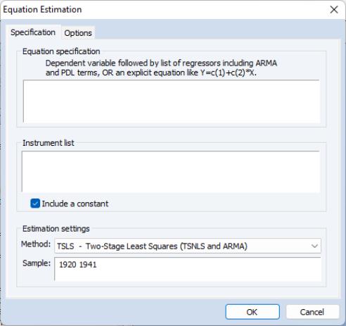 To estimate an equation using Two-stage Least Squares, open the equation specification box by choosing or Choose TSLS from the Method: dropdown menu and the dialog will change to include an edit window where you will list the instruments.