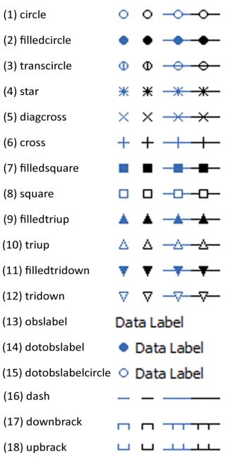 init_options (default = “blank”) | init_options sets initialization options for the labels. For a frozen graph (updating off), you may use the keywords: “current” (keep current labels, or initialize the labels with standard observation labels if custom labels do not currently exist, then add the labels provided), “obsnum” (initialize with observation numbers), or “blank” (set all labels to empty strings, then add the labels provided). For live or frozen graphs, you may use the keywords: “series” (initialize the labels with the values of a series; follow the command with the name of a series instead of labels), or “clear” (delete custom labels if they exist and return to automatic labeling). |