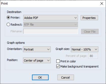 The top section of the dialog may be used to select a printer and print options, or to redirect the print job to an RTF file, graph object, or spool object (see