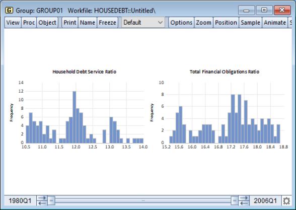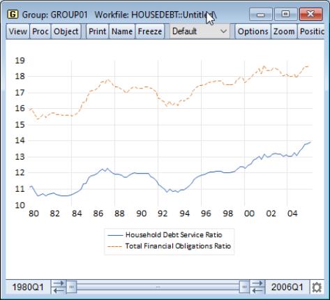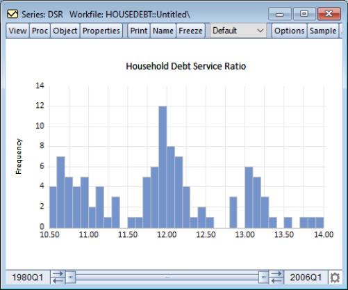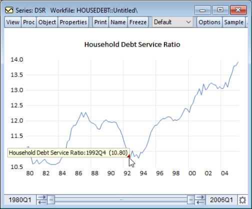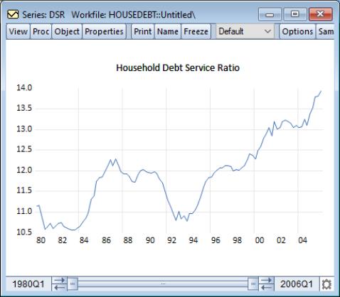 For example, let us consider the example workfile “Housedebt.WF1”, which contains quarterly data on household debt and financial obligations from 1980 to 2006. The series DSR is an estimate of the debt service ratio representing the ratio of the total of mortgage and consumer debt payments to personal income.