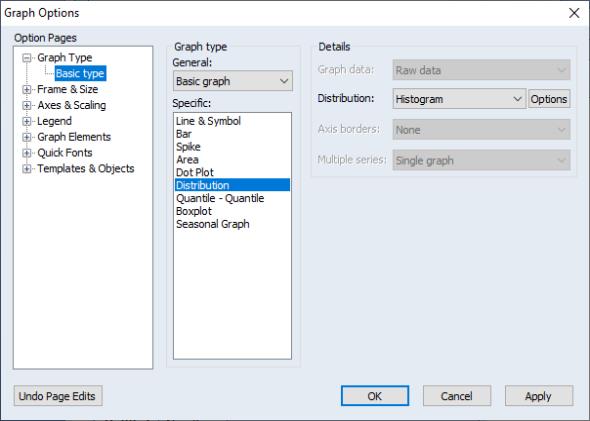 The graph options are broken into several categories, appearing on the left-hand side of the dialog. Make certain that you are displaying the page, then change the specific type to . Notice that there is a dropdown on the right-hand side that offers you choices on which type of distribution graph to produce. Since we want to display the default histogram, simply click on .