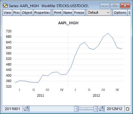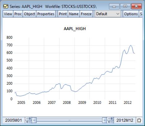 Here, we display a line graph of series containing stock prices in a workfile dated from 2005 to 2012.