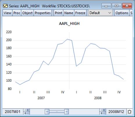 We see the slider bar at the bottom of the window. The left-hand text shows the first observation in the current graph view (“2005m01”) and the right-hand text shows the last observation (“2012m12”). In this example, the display sample spans the entire workfile so the bar is drawn from end to end.