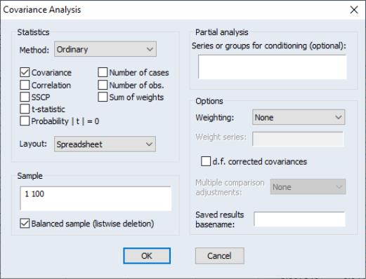 The covariance analysis view may be used to obtain different measures of association (covariances and correlations) and associated test statistics for the series in a group. You may compute measures of association from the following general classes: