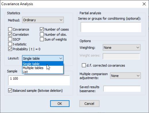 EViews allows you to calculate partial covariances and correlations for each of these general classes, to compute using balanced or pairwise designs, and to weight individual observations. In addition, you may display your results in a variety of formats and save results to the workfile for further analysis.