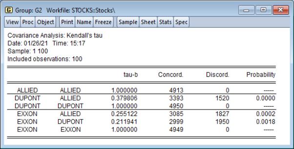 . As a result, textbooks sometimes warn users about computing Kendall’s tau for moderate to large samples. EViews uses very efficient algorithms for this computation, so for practical purposes, the warning may safely be ignored. If you find that the computation is taking too long, pressing the ESC break key may be used to stop the computation.