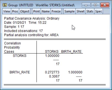 Consider the example from Matthews (2000) in which we consider the Pearson correlation between the number of stork breeding pairs and the number of births in 17 European countries. The data are provided in the workfile “Storks.WF1”.