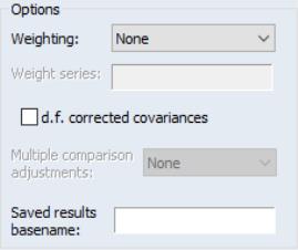 When you specify weighting, you will be prompted to enter a different weighting method and the name of a weight series. There are five different weight choices: frequency, variance, standard deviation, scaled variance, and scaled standard deviation.