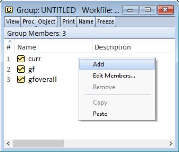 You may change the contents of the group by simply dragging and dropping series objects from the workfile window to the window or by right-clicking on the group right-click on the window and selecting .
