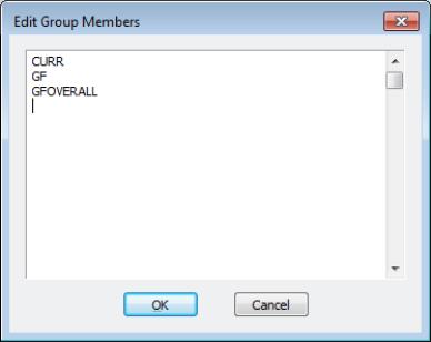 This window allows you to use a text-based format to add, remove, or rearrange series in a group. To add one series to the group, simply place the edit cursor in the desired position and enter the name of the series or the series expression. Removing or rearranging members may be accomplished by cutting and pasting as desired. You may also use the clipboard to cut-and-paste lists of series from group to group or even from other applications into EViews.