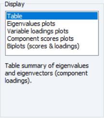 The box allows you to choose between showing the eigenvalues and eigenvectors in a tabular form, or displaying line graphs of the ordered eigenvalues, or scatterplots of the loadings, scores, or both (biplot). As you select different display methods, the remainder of the dialog will change to provide you with different settings.