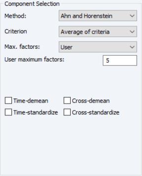 Furthermore, as discussed in Bai and Ng (2002) and Ahn and Horenstein (2013), factor selection procedures can be improved dramatically if time and/or cross-section dimensions are demeaned and/or standardized. To allow for these possibilities, there are four checkboxes associated with each of these options and combinations: