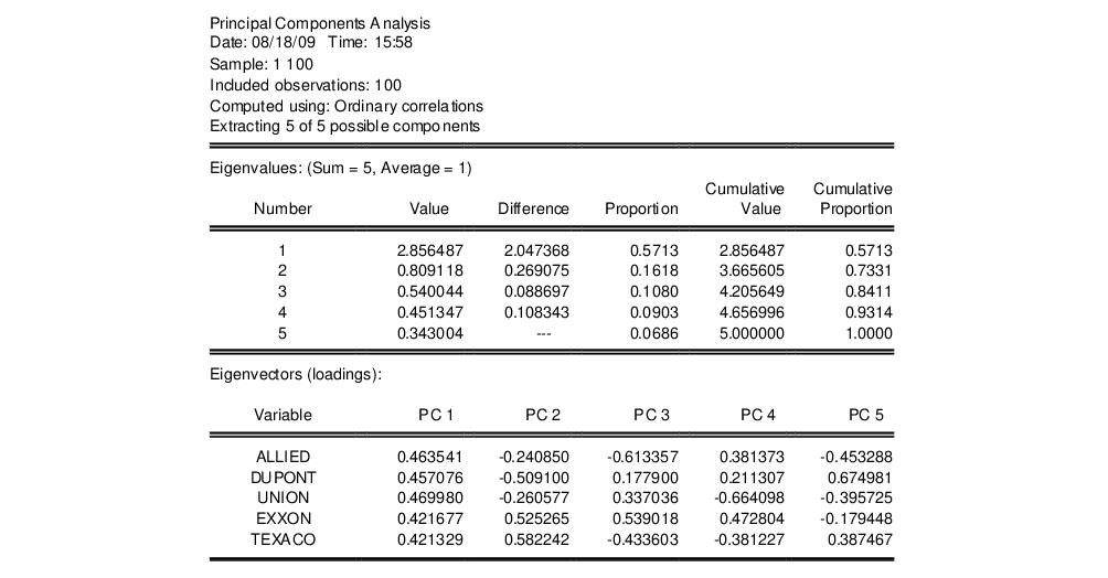 The second section describes the linear combination coefficients. We see that the first principal component (labeled “PC1”) is a roughly-equal linear combination of all five of the stock returns; it might reasonably be interpreted as a general stock return index. The second principal component (labeled “PC2”) has negative loadings for the three chemical firms (Allied, du Pont and Union Carbide), and positive loadings for the oil firms (Exxon and Texaco). This loading appears to represent an industry specific component.