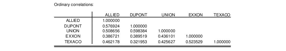 As an illustration, we again consider the stock price example from Johnson and Wichtern (1992) in which 100 observations on weekly rates of return for Allied Chemical, DuPont, Union Carbide, Exxon, and Texaco were examined over the period from January 1975 to December 1976 (“Stocks.WF1”).