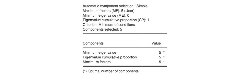 Here, we see that the number of components suggested for each of the simple criteria is 5. The overall criterion uses the minimum of the individual selections, and the number of components selected is also 5.