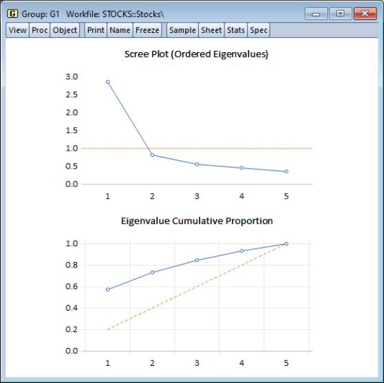 For the stock data, displaying the scree and cumulative proportion graphs yields the graph depicted here. The scree plot in the upper portion of the view shows the sharp decline between the first and second eigenvalues. Also depicted in the graph is a horizontal line marking the mean value of the eigenvalues (which is always 1 for eigenvalue analysis conducted on correlation matrices).