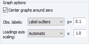 There are three additional options provided under . The first option is to . Unchecking this box will generally enlarge the graph within the frame at the expense of making it somewhat more difficult to quickly discern the signs of scores and loadings in a given dimension.