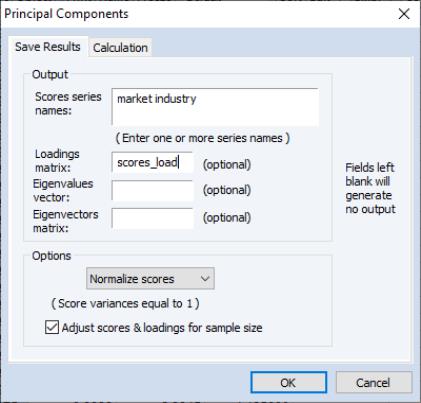 Next, you should enter names for the score series, one name per component score you wish to save. Here we enter two component names, “Market” and “Industry,” corresponding to the interpretation of our components given above. You may optionally save the loadings corresponding to the saved scores, eigenvalues, and eigenvectors to the workfile.
