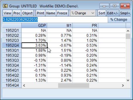 Here, we are editing the data in the group in 1-period percent changes (note the label to the right of the edit field). If we change the 1952Q4 value of the percent change in GDP, from 3.626 to 5, the values of GDP from 1952Q4 to the end of the workfile will change to reflect the one-time increase in the value of GDP.