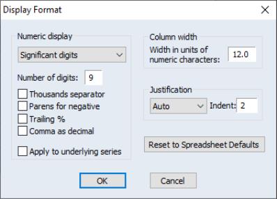 Note that, by default, changes to the group display format will apply only to the group spreadsheet and will not change the underlying series characteristics. If, for example, you elect to show series X in fixed decimal format in the group spreadsheet, but X uses significant digits in its individual series settings, the latter settings will not be modified. To update the display settings in the selected series, you must select the checkbox in the format dialog.