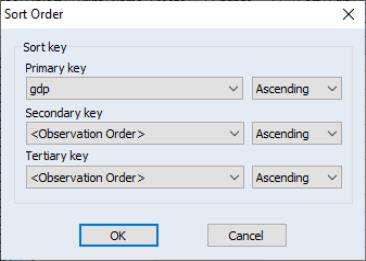 A quicker alternative, assuming you only want to sort by only one series, is to use the right-mouse button menus. Selecting or sorts the observations using the first selected column of data.