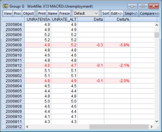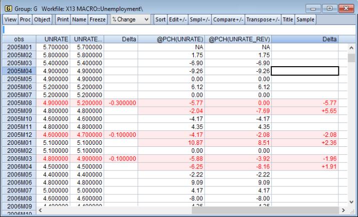 If you change the display type of the group to a setting other than “Default” or “Raw data”, rather than replace the raw series values with the transformation you selected, EViews will remove the “Delta%” column and introduce new columns containing the transformation, and a new “Delta” column containing the difference for that transformation. For example, if we switch the display type of our group to “”, the compare view will contain 6 columns of data - the original UNRATE and UNRATE_REV series, the “Delta” column for those two series, an @PCH(UNRATE) column (containing the percentage change for UNRATE), an @PCH(UNRATE_REV) column (containing the percentage change for UNRATE_REV), and finally a “Delta” column containing the difference between the two percentage change columns:
