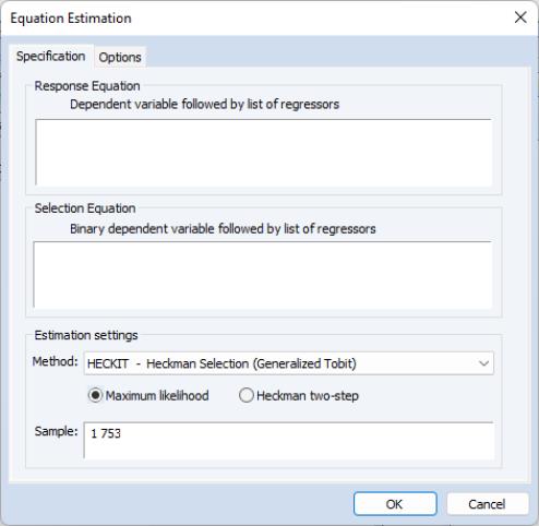 Equation (31.39). Both equations should be specified as the dependent variable followed by a space delimited list of regressors. Note that the dependent variable for the selection equation should be series containing only zeros and ones.