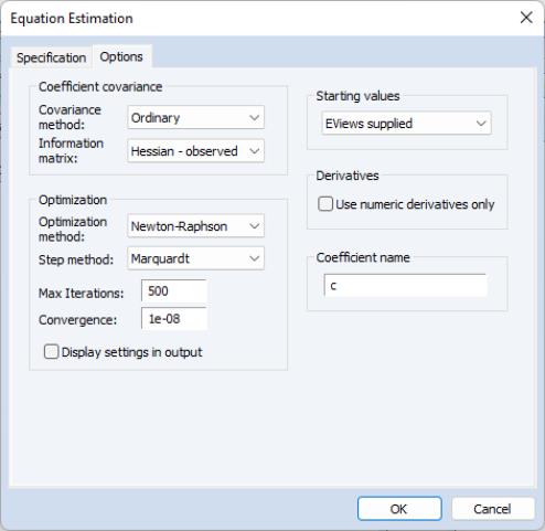 If you have chosen to estimate via maximum likelihood, the tab of the dialog lets you specify the type of covariance matrix, by using the dropdown menu. You may choose from , , and . You may also choose starting values for the maximum likelihood procedure. You may select to perform the Heckman two-step procedure to obtain starting values, or you can down-weight those starting values by choosing a multiple of them. The option will use the specified coefficient vector in the workfile to obtain starting values.