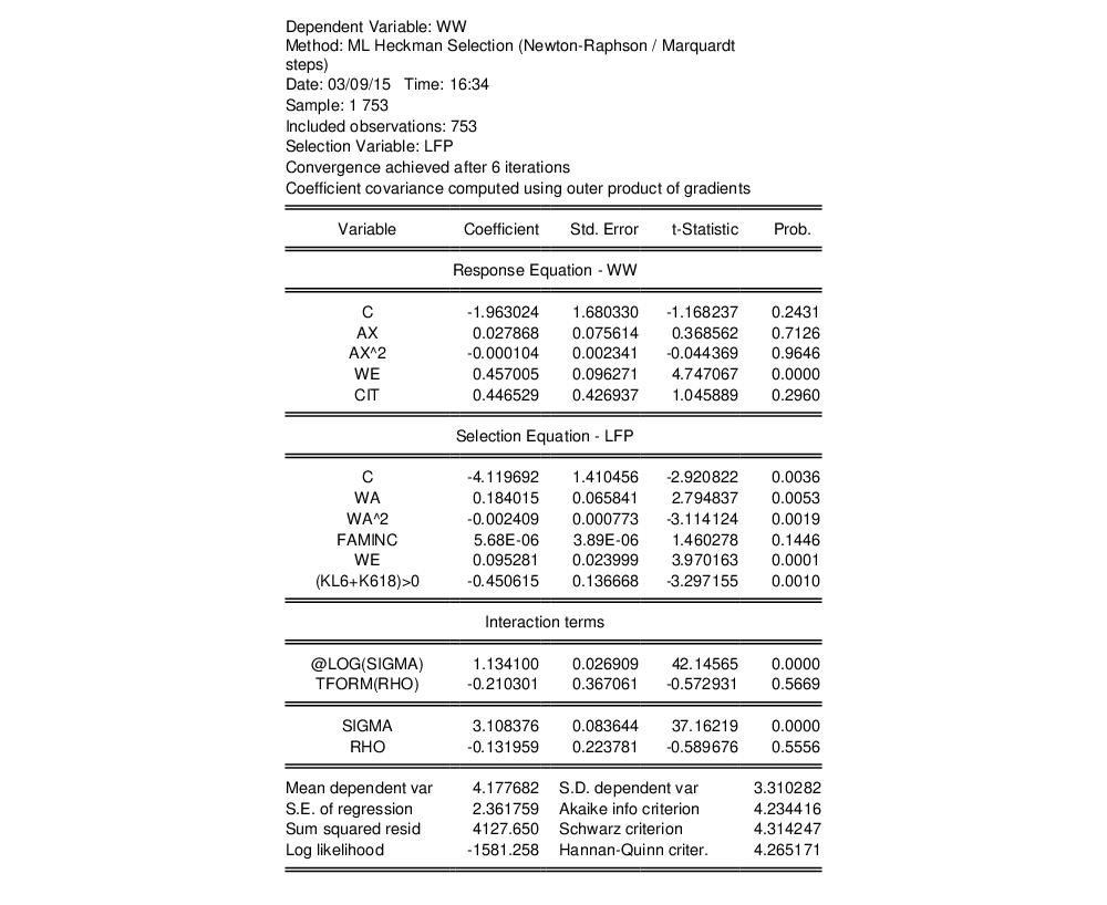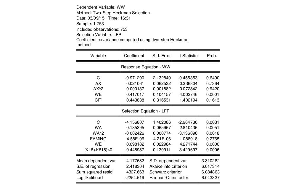 EViews offers two different methods of estimating this model: Heckman’s original two-step method and a Maximum Likelihood method.