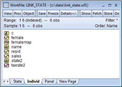 For example, suppose that we open a workfile containing the state and individual pages. Here we see the individual page containing the state TAXRATE data linked into the link series TAXRATE2. From the (colored) series icon, we see that TAXRATE2 is a link of a numeric series.