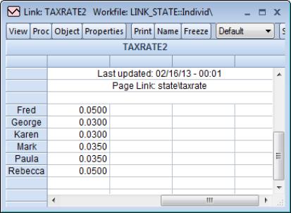 If the TAXRATE2 link is not in use, the link series contains no values and takes up no memory. Links are placed in use either by opening the link window, by placing the link in a group object, or by using the link in a series expression. Whenever the link comes into use, or one of the link components is changed, the link is evaluated, and its values updated as necessary.