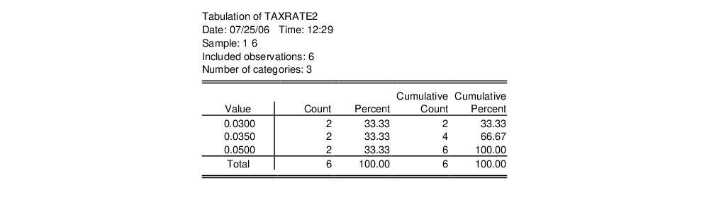 All of the menus and toolbars are those found in ordinary series—you may work with this link as though it were any ordinary series. Indeed, the only hint you will have that TAXRATE2 is not an ordinary series or alpha series is in the titlebar, which will indicate that we are working with a link object. For example, if you select uncheck the grouping settings, and click on to continue, EViews will display a frequency tabulation of the contents of the link, just as it would for an ordinary series.