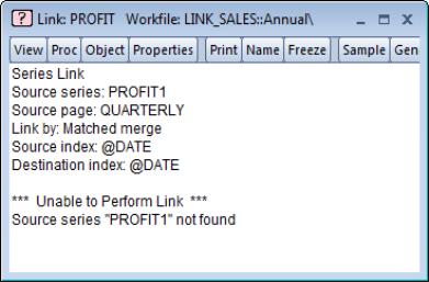 If you attempt to open a link that is improperly defined, either because the source or ID series are not found, or because the observed data require a contraction or frequency conversion method that has been disallowed, EViews will display a link view showing the definition of the link and the error encountered. If you attempt to use this link, you will find that all of the link values are set to NA.