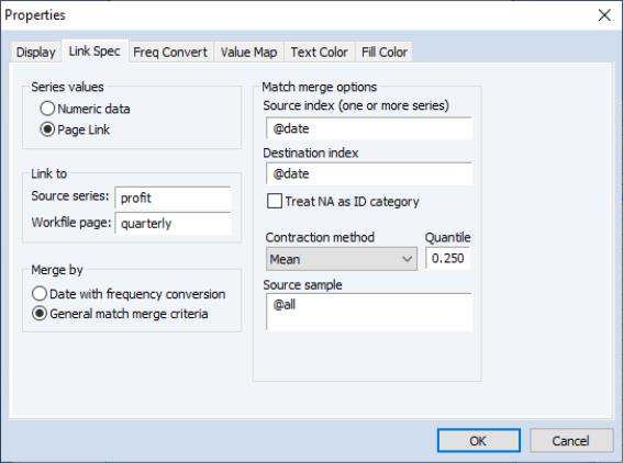 Here we see that the current link uses the PROFIT series in the QUARTERLY page as the source. The link is performed by general match merge, using date matching to link the quarterly dates to the destination series DT. The match merge first performs a mean contraction of the PROFIT series over the entire sample, and then performs the match merge.