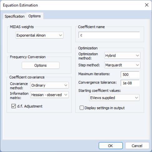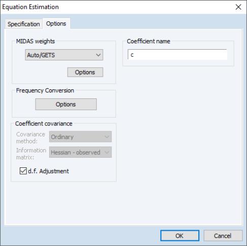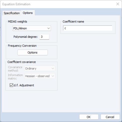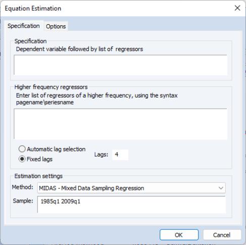 To perform MIDAS estimation in EViews, open the equation dialog by selecting , or by selecting and then selecting from the dropdown menu to bring up the MIDAS estimation dialog: