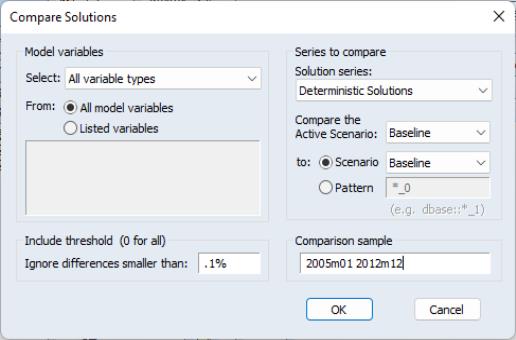 Once you have solved your model for different scenarios, you may wish to quickly compare the results between those scenarios to see which variables differ. Clicking on the menu item ... brings up a dialog that allows you to do this. The first part of the dialog is similar to that of the data display dialog above. Select which variables you would like to compare by using the drop-down box, and the edit field.