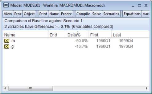 In this case we are comparing the solution between the Baseline scenario (_0) and Scenario 1 (_1), and two variables, M and G, have a difference greater than the specified tolerance of 1e-04. The four columns in the table show details about the variables. The first shows the variable name. The second, Delta%, shows the maximum difference between the two series for each variable. The third and fourth columns, “First” and “Last”, give the date (or observation number) of the first period in which the two series differ and the last period in which the two series differ. Here, the first period in which M_0 differs from M_1 is 1960Q1, and the last period in which they differ is 1999Q4.