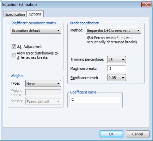 Next, click on the tab to display additional settings for calculation of the coefficient covariance matrix, specification of the breakpoints, weighting, and the coefficient name.