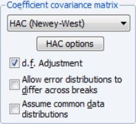 If you specify either the White or HAC form of robust covariance, EViews will commonly display the checkbox. EViews generally follow Bai and Perron (2003a) who, with one exception, do not impose the restriction that the distribution of the