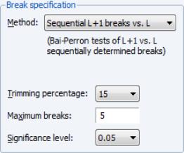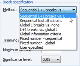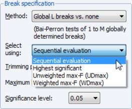 • For the method, there are four possible sub-methods. The method chooses the last significant number of breaks, determined sequentially. Selecting chooses the number of breaks that is largest from amongst the significant tests. The latter two settings choose the number of breaks using the corresponding double max test.