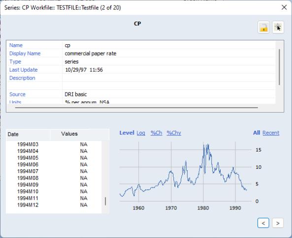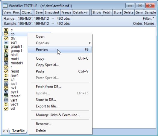For example, here, we see a series preview window for the series CP which is located in the workfile “Testfile.WF1”. CP is the second (alphabetically) of the 20 objects in this workfile.