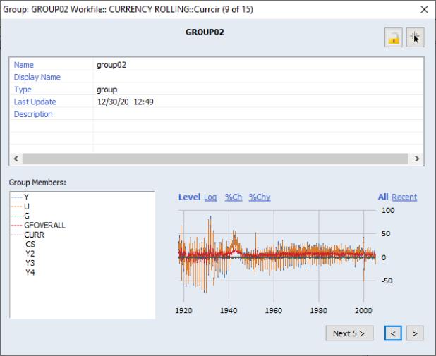 EViews offers a preview tool for those times when you wish to quickly look through a number of objects. Instead of opening and closing each object, you may use the preview to quickly scroll through a preview of each object, viewing metadata (name, type, description, frequency, last update, source, units, etc.) and object type-specific information (for example, series will show observation data and a small graph while equations will show estimation output).