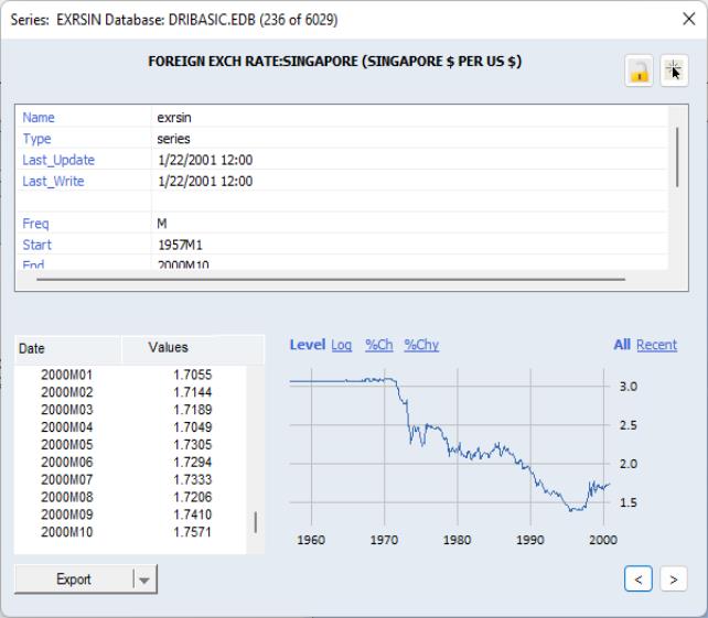 For the series object depicted here, the bottom area shows a spreadsheet of the values in the series and a graph of the values in the series. Notice that you can interact with the graph: change the display to show the levels of the series, or simple log, percentage change, and year percentage change transforms of the data; click on to change the graph to only show recent values of the series or all to show of the values in the series.