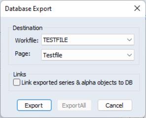 You can control the workfile and page destination, whether to export series and alpha objects as links or by (the default) copying of current values. Clicking on exports only the currently displayed object. Clicking on exports all selected objects.