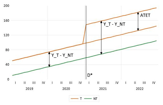to be unbiased for the ATET, DiD requires an additional parallel trends assumption. The parallel trends assumption requires that in the counter-factual where individuals in the treated group are not treated, the difference between the treatment group and the control group is constant through time. Intuitively, when comparing a treatment group to a never-treated or always-treated control group, unbiased estimation requires that the change in outcomes for the control group before and after the treatment date is a good measure of the (unobserved) untreated change in the treatment group.