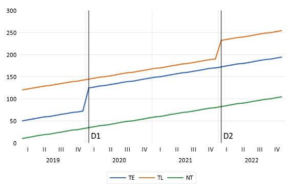 , on which some of the individuals in our study are given the treatment. The remainder of the individuals never receive treatment. We denote the treated individuals as belonging to group T, and those not treated as belonging to group NT. Along with data on whether an individual is treated, we also have time series data on an outcome variable, Y, with periods both before and after the treatment date, for all individuals.![]() | (56.1) |