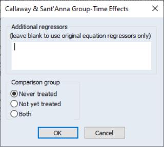 • The Additional regressors edit field allows you to estimate the Callaway and Sant’Anna model on the underlying estimated TWFE model, but with additional regressors. This allows you to estimate models via Callaway and Sant’Anna that may be impossible to estimate via TWFE due to perfect collinearity. Simply enter the name of series, or series expressions, you wish to add to the estimation in the edit field.